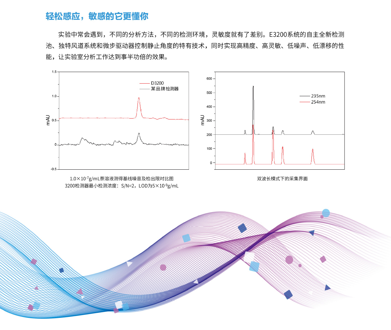 D3200係列紫外-可見檢測器作為高效小黄鸭官网下载的檢測單元,具有雙波長功能,並且配備了氘燈和鎢燈兩種光源。可便捷地與各種液相色譜輸液泵、自動進樣器、色譜柱恒溫箱等其它單元配合使用,也可以單獨作為檢測工具使用。
