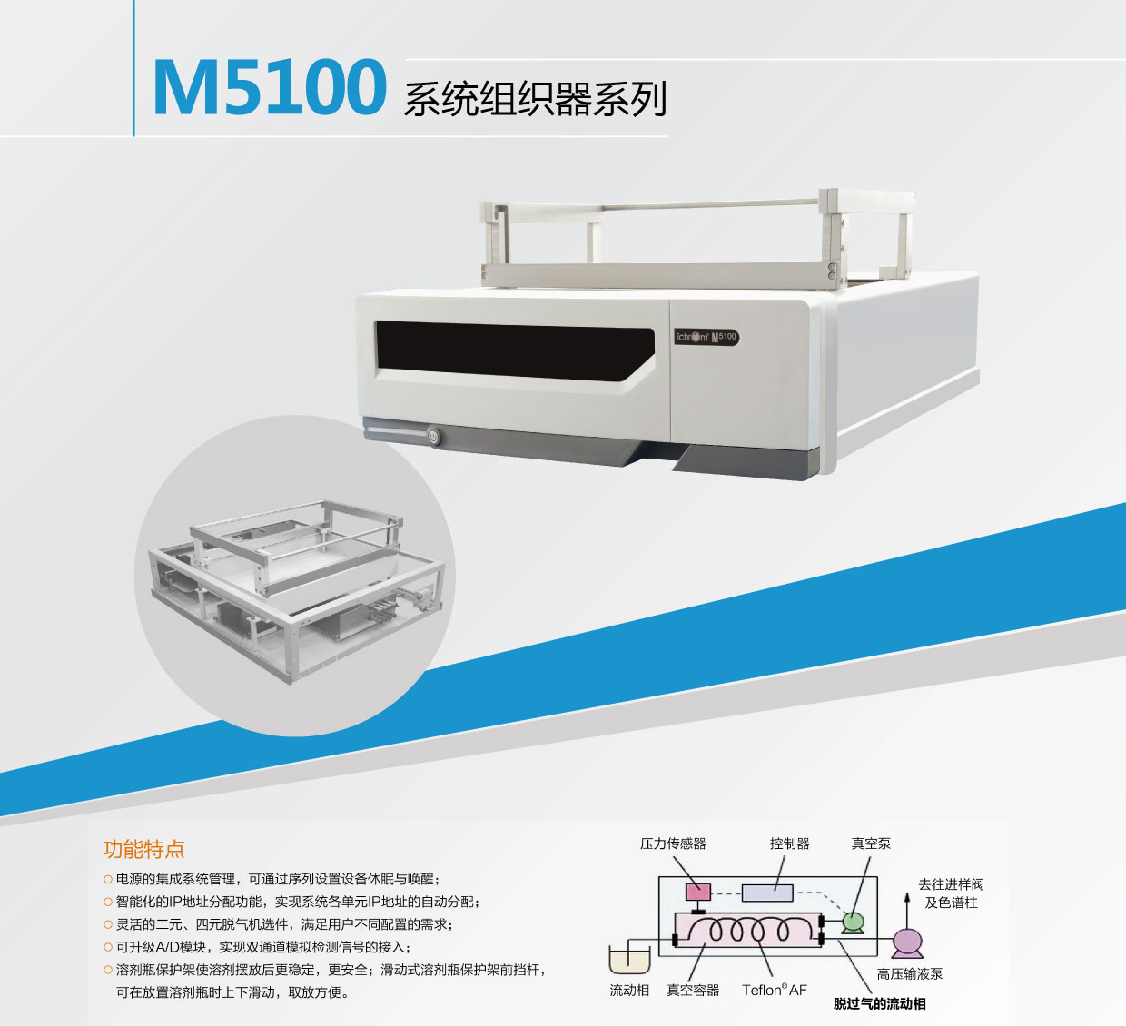 M5100係統組織器是iChrom 5100產品中多功能集於一體的單元部件,它集成了在線脫氣機、溶劑瓶托盤及高性能液相色譜專用溶劑瓶。它是5100產品網絡數據通信、電源分配的樞紐,確保了實驗數據的準確性、可靠性;優化的管路連接,方便對溶劑的維護管理。M5100組織器包括兩個型號:M5101和M5102係統組織器,M5101是不帶脫氣功能的係統組織器,M5102為帶脫氣功能的係統組織器。